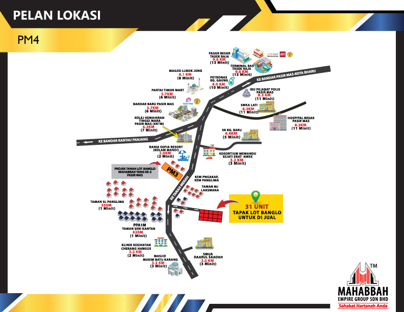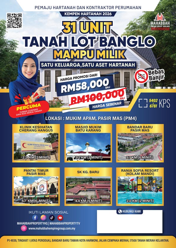 Tanah lot banglo di Mukim Apam, Pasir Mas, Kelantan merupakan projek tanah lot banglo mampu milik MEGSB yang ke-empat di daerah Pasir Mas (PM4). Keluasan bagi setiap lot banglo adalah dari 5402 kps hingga 6781 kps. Untuk maklumat lanjut boleh hubungi Mahabbah Empire Group atau whatsapp kami di Mahabbah Property.